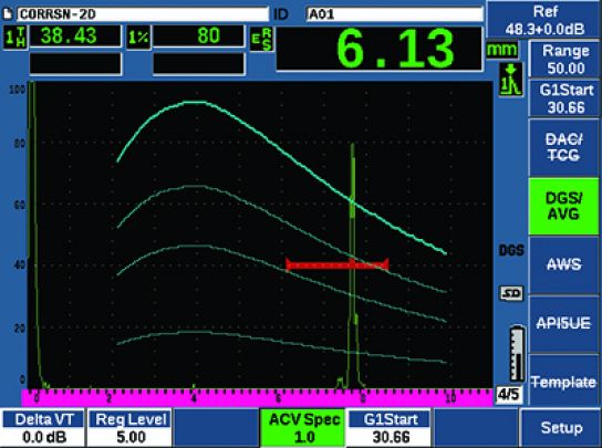 其它測量 | DGS/AVG的上沖值(dB)、DGS/AVG的ERS(等效反射體大?。WS D1.1/D1.5的A、B、C和D值定級、抑制值、回波到參考dB值。 |