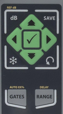 EPOCH 650型儀器的瀏覽鍵區是EPOCH探傷儀的標志性特色。瀏覽鍵區的向上、向下箭頭鍵用于參數的粗略調節,向左和向右箭頭鍵用于參數的細微調節。瀏覽鍵區還包含其它幾個功能及常用參數,如:增益、保存、確定鍵及退出鍵。瀏覽鍵區配置的設計符合IP67的要求。