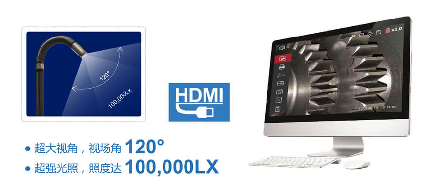 C50電控高清工業(yè)內(nèi)窺鏡微軟雅黑后置大功率LED照明,光纖導(dǎo)光,照度高達10萬Lx,適用于黑暗及惡劣環(huán)境,照度是普通內(nèi)窺鏡的50倍,并具有亮度7級循環(huán)調(diào)節(jié)功能,檢測中可根據(jù)環(huán)境光源及時調(diào)整。多景深、多視場角,讓初次使用者也能獲得良好的檢測效果。配備HDMI視頻高清輸出接口,通過專用數(shù)據(jù)線與PC端連接,非常適用于機修師檢測,有助于快速找到被檢測物的問題,解決難題。