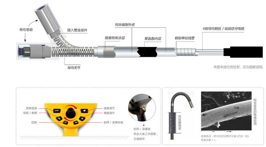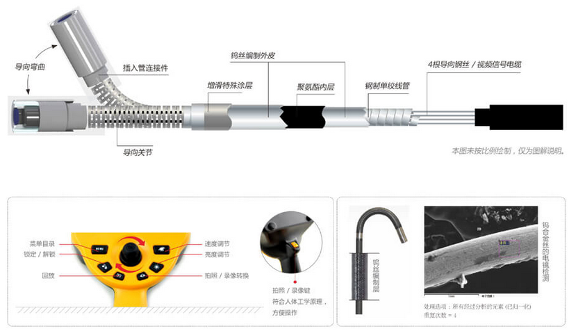 C50電控高清工業(yè)內(nèi)窺鏡采用新型雙鎢合金絲材料編制的四層插入管,比不銹鋼絲插入管擁有更為緊密的編織層,讓插入管的耐磨性能提高20倍,柔韌性能提升4倍,使用壽命與操作的靈敏性同時增強。