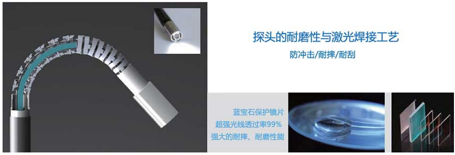 C50電控高清工業(yè)內(nèi)窺鏡、插入管的探頭部分使用具有高度耐磨性能的鈦合金,鈦合金所具有的耐磨強度是普通不銹鋼的100倍;為進一步保護鈦合金探頭,采用了藍寶石保護鏡片,它的強度是普通石英石鏡片的8倍,鋼化玻璃的20倍,提升防沖擊、耐摔、耐刮性能,有效避免被檢設(shè)備的二次破壞。
