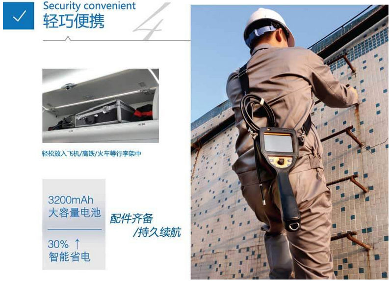 C50電控高清工業(yè)內(nèi)窺鏡運用超輕設(shè)計,整機(含電池)僅重1.45Kg,同時配備真皮肩包,安全、便攜,不論檢查環(huán)境是百米高塔上的風(fēng)輪機齒輪箱,還是復(fù)雜的大型機械,C50工業(yè)內(nèi)窺鏡都能夠得心應(yīng)手。