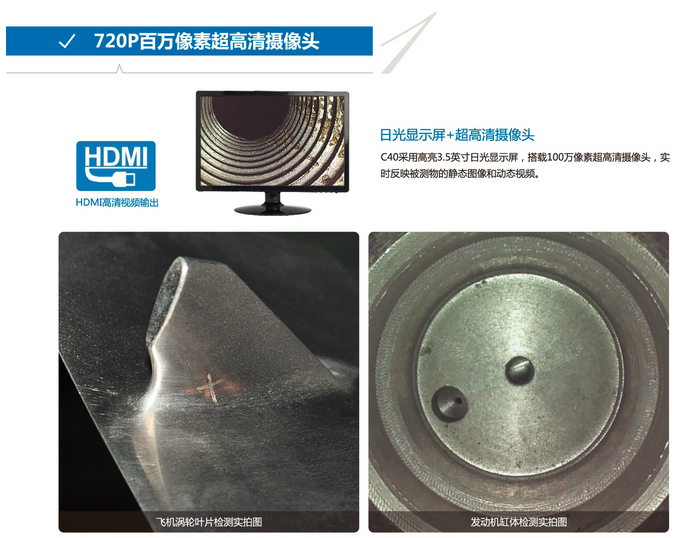 C40采用3.5英寸日光顯示屏,陽光下也清晰可見。搭載720P百萬像素超清攝像頭,可清楚精確地反映被測物的靜態圖像和動態視頻。