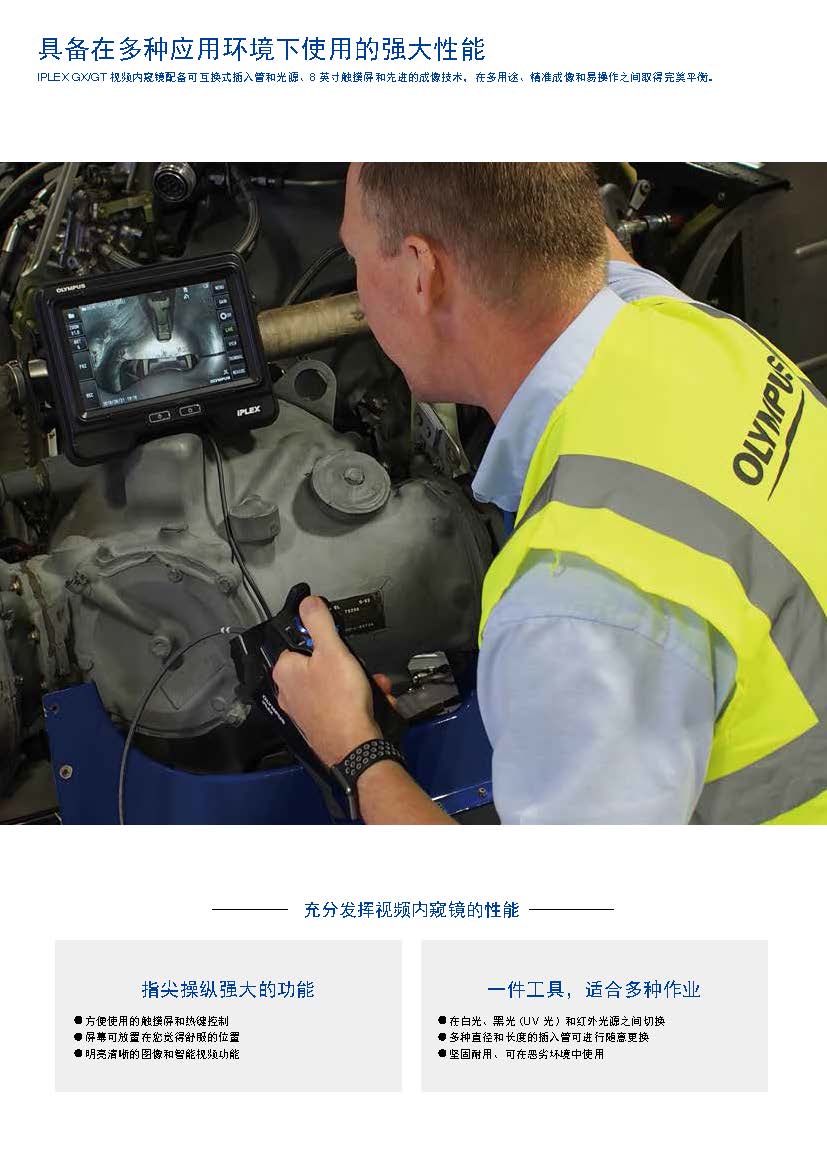 具備在多種應用環境下使用的強大性能IPLEX GX/GT 視頻內窺鏡配備可互換式插入管和光源、8 英寸觸摸屏和先進的成像技術,在多用途、精準成像和易操作之間取得完美平衡。