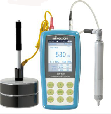 SU-400里超硬度計是一款結合動態反彈里氏測量方法和靜態超聲波維式測量方法的二和一便攜式硬度計,SU-400不僅可以支持超聲波手動1Kg,2 Kg,5 Kg,10 Kg探頭和電動0.3 Kg,和1Kg探頭進行超聲波接觸阻抗法測量,而且還支持里氏測量的7種動態沖擊裝置,即D,DC,DL,D+15,C,E,G進行動態里氏反彈測量。
